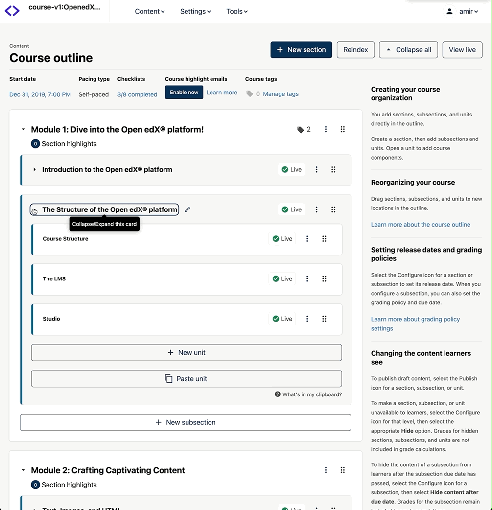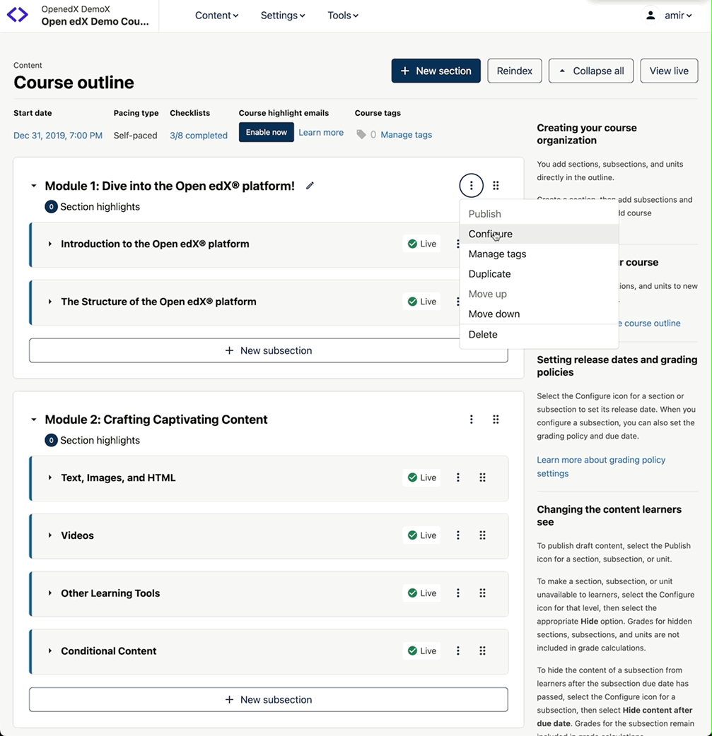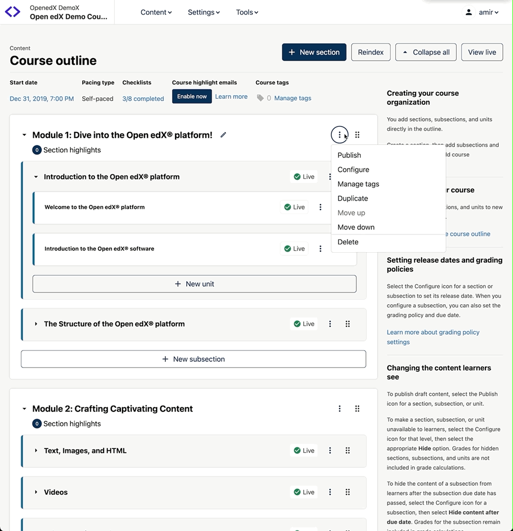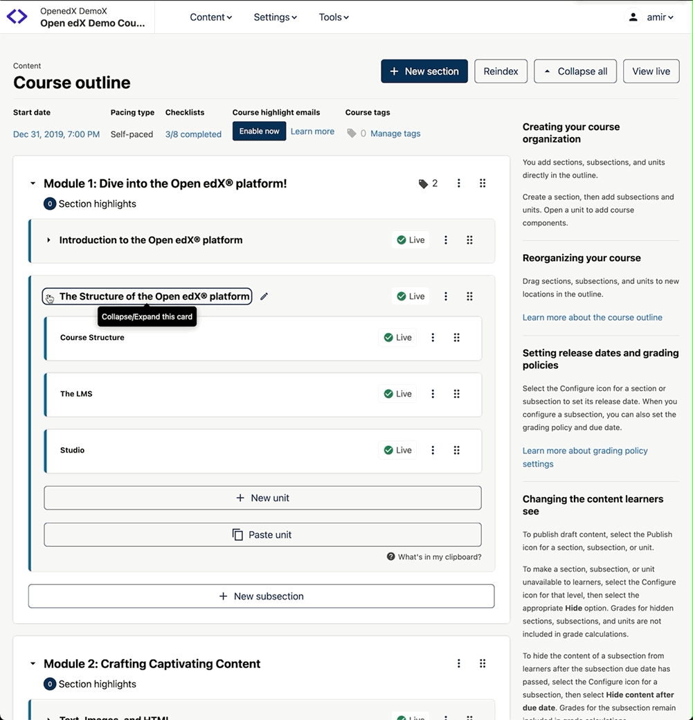 A tagging tool that lets authors add tags to full courses, as well as to content within courses, including individual text, video and problem blocks, units, subsections and sections Support for any third-party taxonomy, empowering course teams to choose their preferred taxonomy or to create their own The new Content Tagging feature is available by default. If your system is not yet running the Course Authoring MFE, talk to your operations team to enable it.